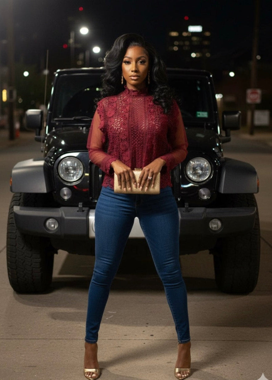 This bold red lace blouse brings pure sophistication with its delicate lace and mesh design from front to back. It features a high neckline, slim arms fitted long sleeves, and a slim-cut silhouette that flatters a slender frame. Crafted with minimal stretch, this piece is tailored for a close fit through the arms and body, offering a sleek and elegant look.